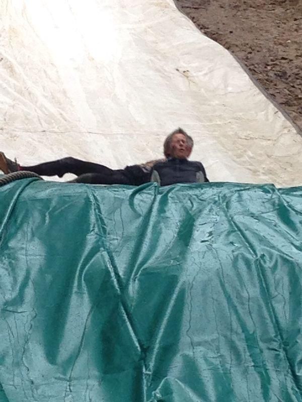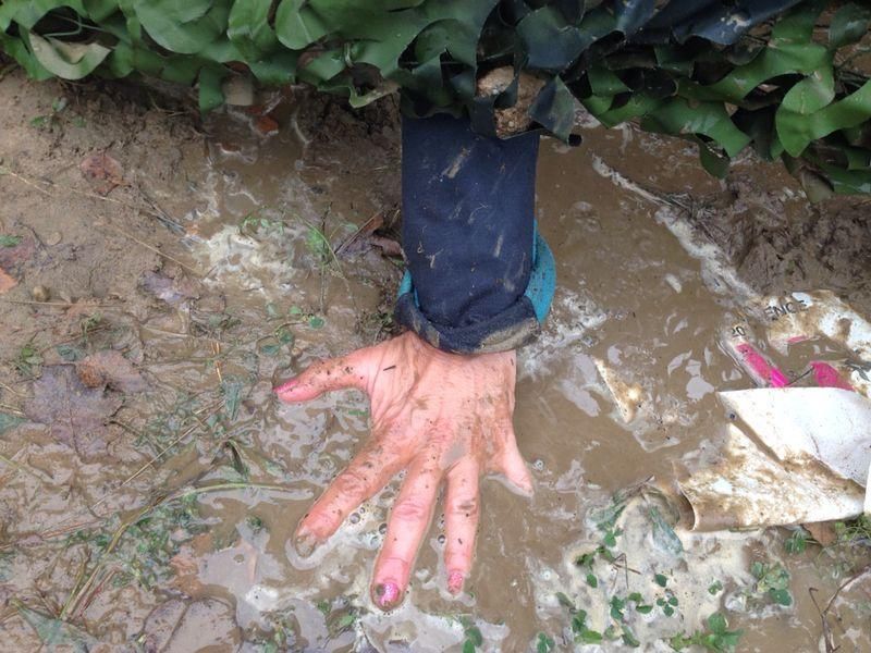 Der Schlamm wird an der Rutsche aus den Schuhen gesprengt, um danach mit braunem kaltem Lehmschlamm neu gefüllt zu werden. Die Blasen werden aufgerieben und füllen sich mit Heidesand.