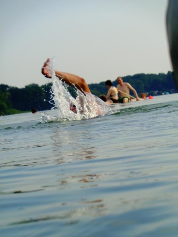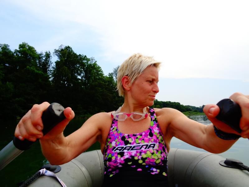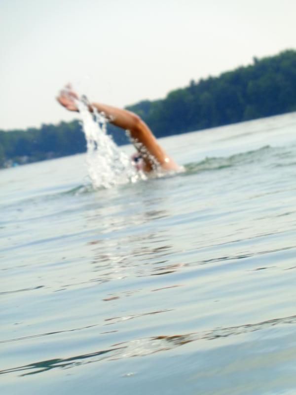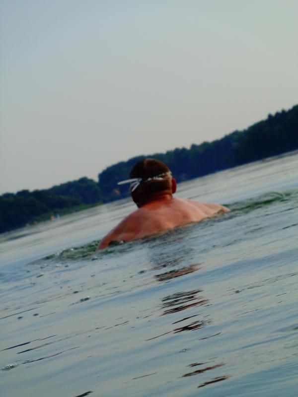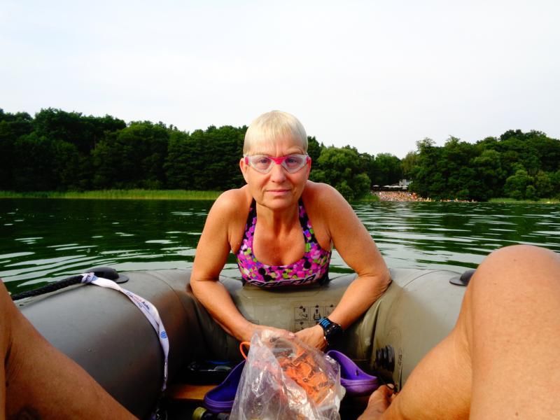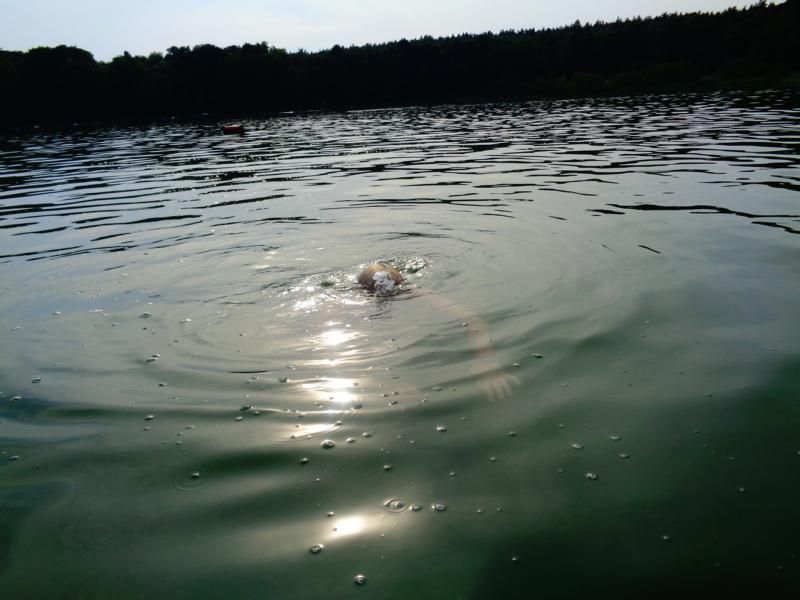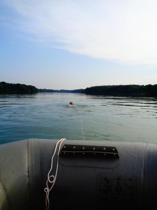 Zurück zog ich sie dann am Seil... das Boot ließ sich gut ziehen. 1,7 Km (?) im Wechselstil Kraulen und Brustschwimmen. Technische Sachen konnte ich gut beachten.