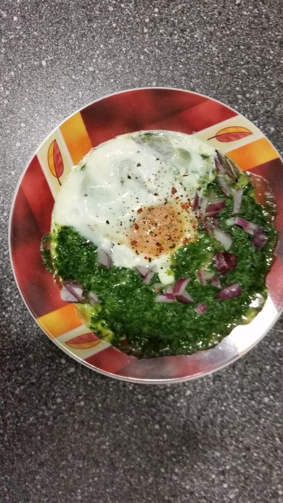 1.Spinat mit Zwiebel und Ei, 5 Minuten bei 800 Watt in die Mikrowelle: Lecker!