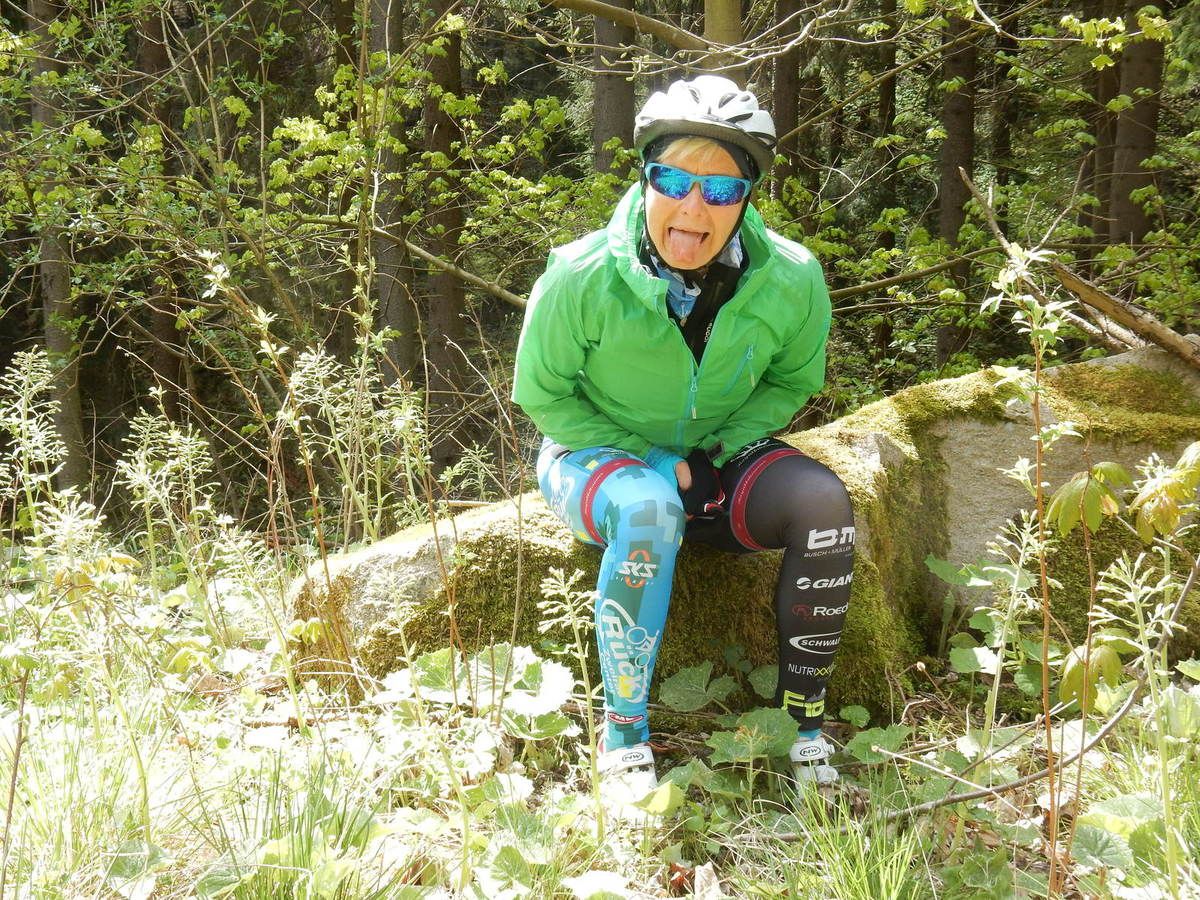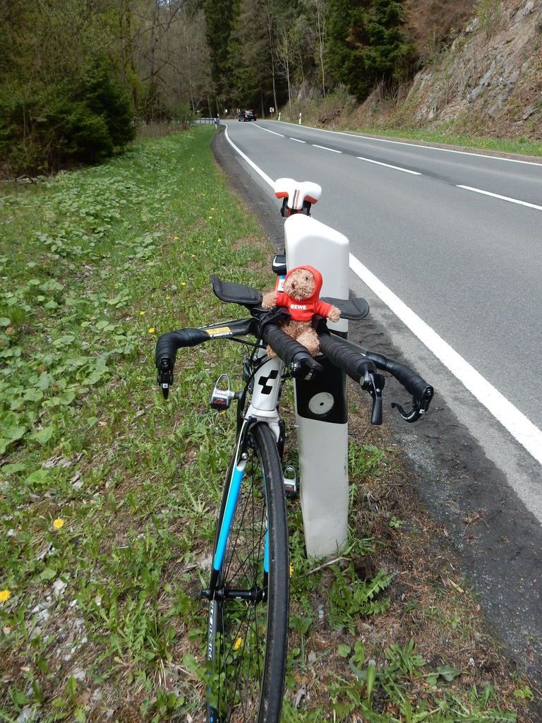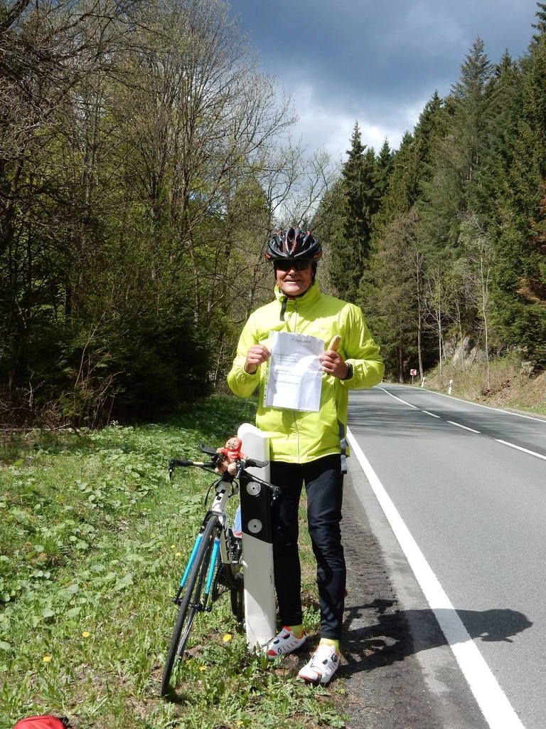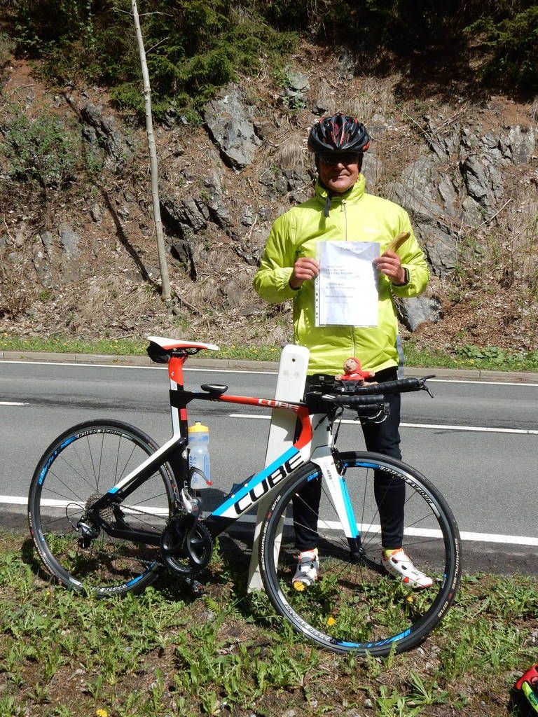 Bereits auf den ersten Kilometern wurde mir klar, die Radhose war ein Fehler. Auf gerader Strecke geht das ja, aber bei Steigungen bis zu 8 % und mehr ein Unding. So war ich dann ca. 1 km vor dem Gipfel wegen der enormen Kraftanstrengung (Überwindung des Drucks der Radhose beim Treten) so platt, dass ich absteigen musste.