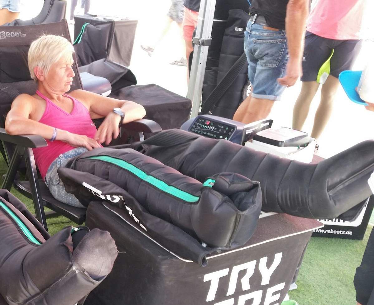 Danach noch ab ins Zelt zu den Duschen. Wie lange ist hier das Wasser heißt? Könnte drunter schlafen, wenn nicht noch mein Rad in T2 auf mich warten würde. Lasse ein letztes Mal einen geschulten Blick auf meinen Fuß werfen und den Verband wechseln. Alles beim alten. Fast jedenfalls. Beide Füße sind etwas „geweitet“ oder besser mehr durchblutet als sonst. Waren doch ein paar Kilometer heute. Alles richtig gemacht.