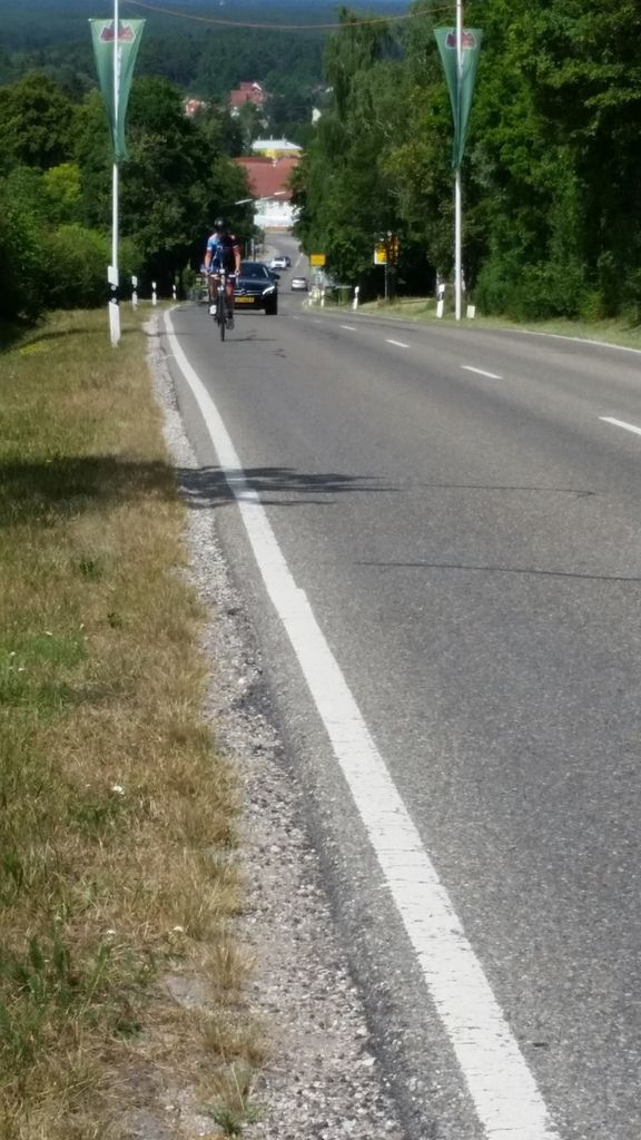 In Radrunde Nummer zwei darf bzw. muss ich miterleben, wie nah Glück und Pech hier beieinander liegen können. Eine lebensmüde Katze will die Straße überqueren und mein Vordermann Eddie verfehlt das Tier nur knapp. Fast fünfzig Sachen auf dem Tacho. Ich überhole mit den Worten „Lucky Eddie“. Wir schütteln lachend die Köpfe. Weiter! Später steht in einem Dorf jemand mit einer Radpanne am Straßenrand. Zwei, drei Schritte rückwärts auf die Straße. Schlechte Idee. Mein Vordermann dort – dieses Mal ist es nicht Eddie - fährt ... Naja. Höre noch wie es kracht. Kann ausweichen. Die Windschattenbox bietet ausreichend Sicherheitsabstand. Polizei und Sanitäter sind in Sichtweite und sofort zur Stelle. Werde später nach dem Rennen hören, dass jemand mit dreißig Stichen im Gesicht genäht werden musste. Schätze, das war dieser Pechvogel. Gute Besserung.