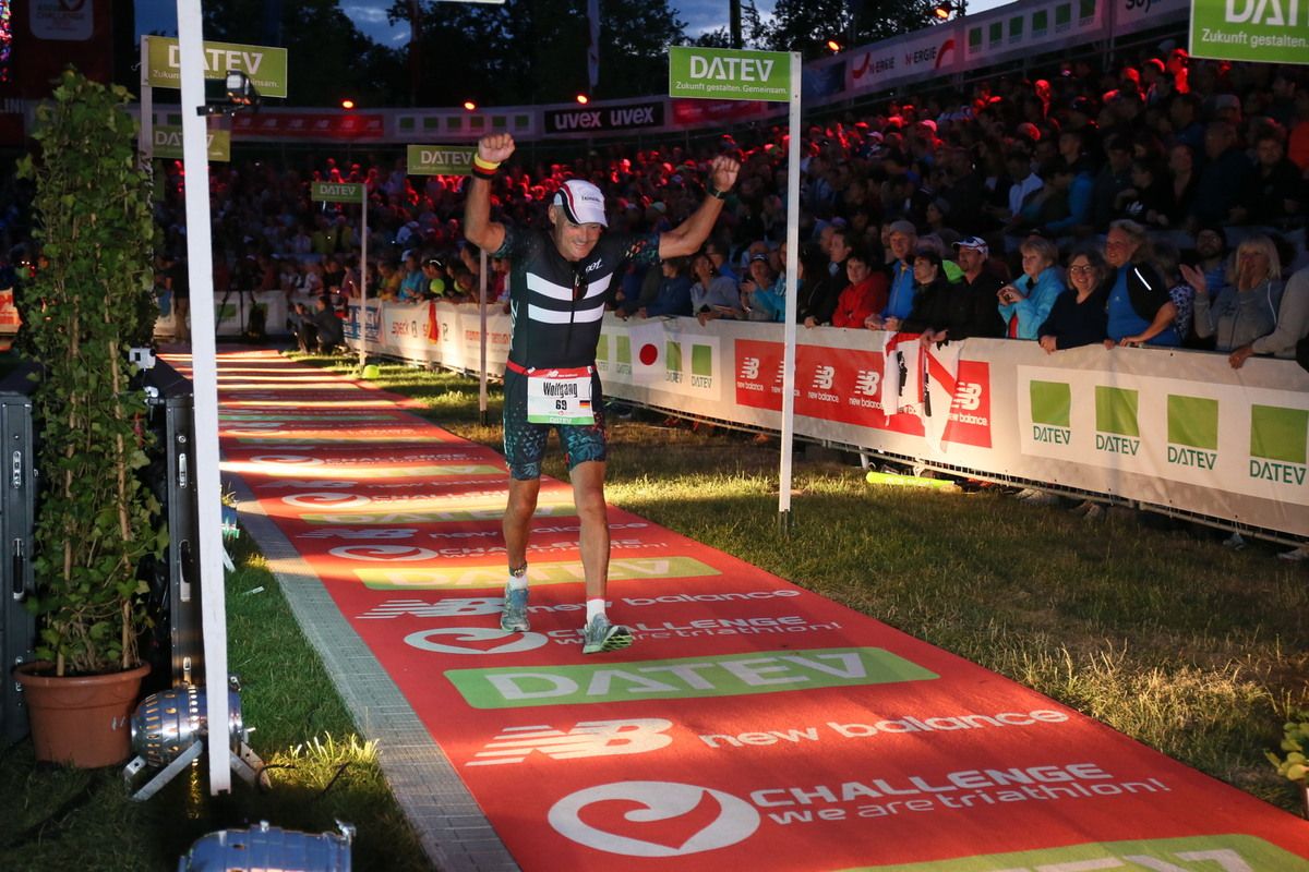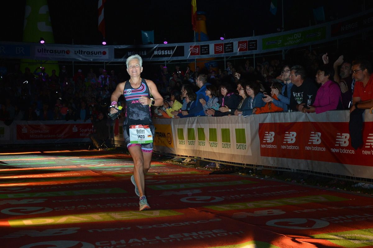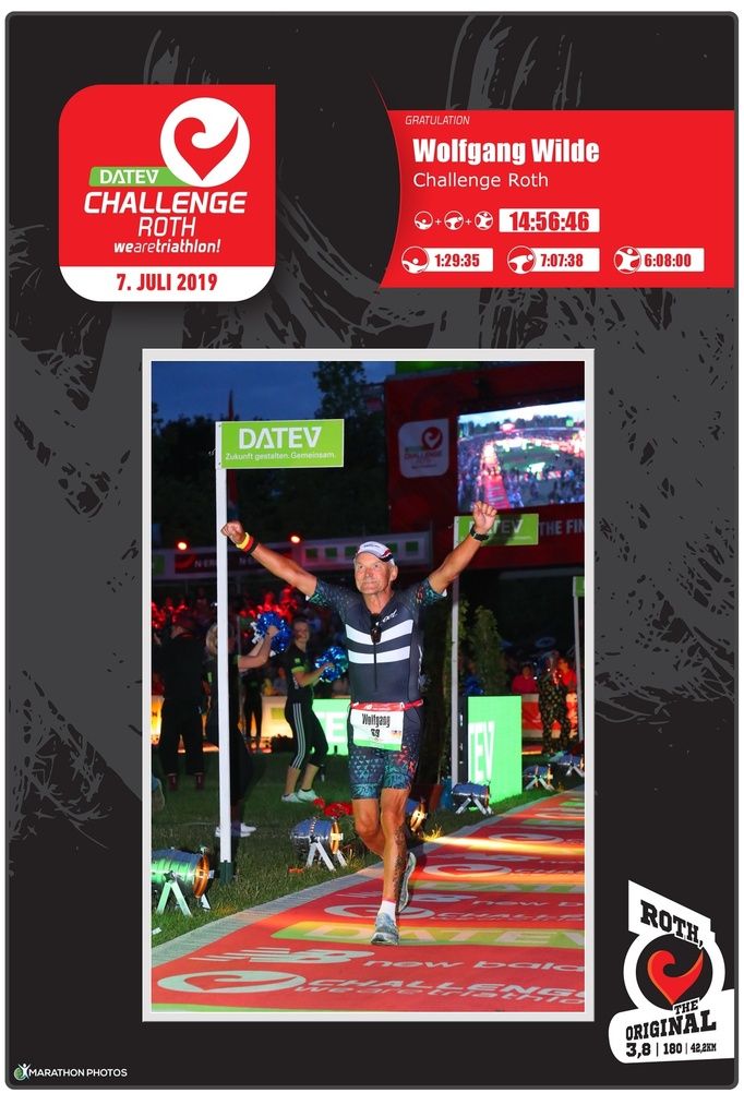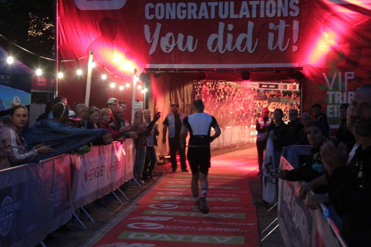 Los geht’s, Laufen. Marathon Nummer 22. Nein, dafür gebe ich keinen aus. Keine Probleme hier reinzukommen.. Kann mich an Hamburg vor zwei Jahren noch gut erinnern. Das war echt komisch. Die ersten Kilometer dahinwackeln. Heute nicht. Alles locker. Der Marathon mit dem Fuß machte mir nur kurz Angst. Was muss ich laufen, damit ich ins Ziel komme? Im Notfall ein langer Spaziergang. Kein Problem. Lasse mir besonders an den Verpflegungsstationen Zeit. Komme mit einer Ausnahme an jeder genau zwei Mal vorbei. Zeit für ein paar Wortwechsel. Zeit für ein Danke. Bei Kilometer zehn frage ich, wer das Ganze hier gewonnen hat. Keine Ahnung. Kein Plan. Hier sind alle seit Stunden mit Begeisterung beschäftigt bei der Sache. Athleten wollen bedient und bespaßt werden. Warte, bis das jemand beantworten kann. Danke und weiter. Komischer Marathon heute. Intervalltraining ist wohl der richtige Ausdruck. Laufen und Gehen wechseln sich ab. Schmerzen aus dem Weg gehen. Das kannst du ein anderes Mal wieder machen. Überhole einige Athleten mehrmals. Liegt an meinen vielen Zwischenstopps. Komme nicht umhin, andere Athleten zu motivieren. Hand links rausstrecken und abklatschen. Einige sind echt fertig und haben das dringend nötig. Zuschauer gibt es auch noch reichlich. Besonders an den Hotspots wird es laut. Könnte manches Mal bei der Musik mitsingen. Egal was du tust, dein Name schallt dort auch das ein oder andere Mal durch den Lautsprecher. Auch in abgelegenen Ecken der Strecke ist noch etwas los, obwohl die Spitze schon seit Stunden im Ziel ist. Stehen einfach nur klatschend da oder machen Musik. Besonders deutlich wird es ab Kilometer 33. Ein letztes Mal raus aus Roth und Richtung Büchenbach. Ekelig hügelig. Schlechter Zeitpunkt in einem Marathon. Es wird langsam dunkel und geht durch einen Wald. Sitzt da ein Pärchen und trommelt drauf los. Mitten im Wald. Als ich nach fünf Kilometern wieder hier vorbeikomme, sitzen sie noch immer da. Genauso laut wie zuvor. Sie werden wohl bis zum bitteren Ende hier bleiben. Die Sorte Zuschauer, die ihre Lieblinge an der Strecke begleitet, ist heute auch im Überfluss vorhanden. Ein Exemplar sehe ich auf der Laufstrecke fünf oder sechs Mal. Ohne Rad. Frage mich, wie der das macht. Irre. Weiter Richtung Ziel. Die letzte Verpflegungsstation in der Nähe vom Markt darf nicht fehlen. Viel ist nicht mehr im Angebot. Stehe trotzdem etwas überfordert da und kann mich nicht entscheiden. „Habt Ihr Leberwurst?“ Zu meiner Überraschung gab es hier tatsächlich mal welche. Das letzte Brötchen ging hier vor ein paar Minuten über die Theke. Ok, eine Wiener ist auch gut. Außer Flüssignahrung, Bananen, Kräckern und Süßkram gab es seit früh um fünf nichts. Auch hier ein letztes Danke. Die letzten zwei Kilometer warten. Links und rechts stehen wieder Absperrgitter. Je näher es zum Ziel geht desto lauter wird es. Einmal nach links und rauf auf den Zielteppich. Der ist schon eine gefühlte Ewigkeit vor dem Stadion beleuchtet. Bist du irre? Warum wolltest du hier im Hellen ankommen? Heute wenigstens ein einziges Mal Gas geben bis die Lunge kreischt. An einigen Staffelteilnehmer vorbei und ins Stadion rein. Volle Beleuchtung und Beschallung auf Anschlag. 14.000 Menschen auf den Rängen. Mir fehlen noch immer die Worte. Kurze Stadionrunde und Arme raus zum Landeanflug. ...
