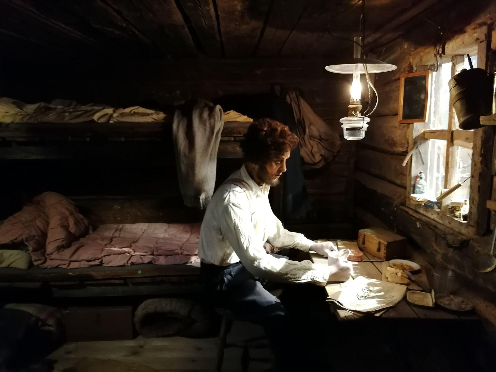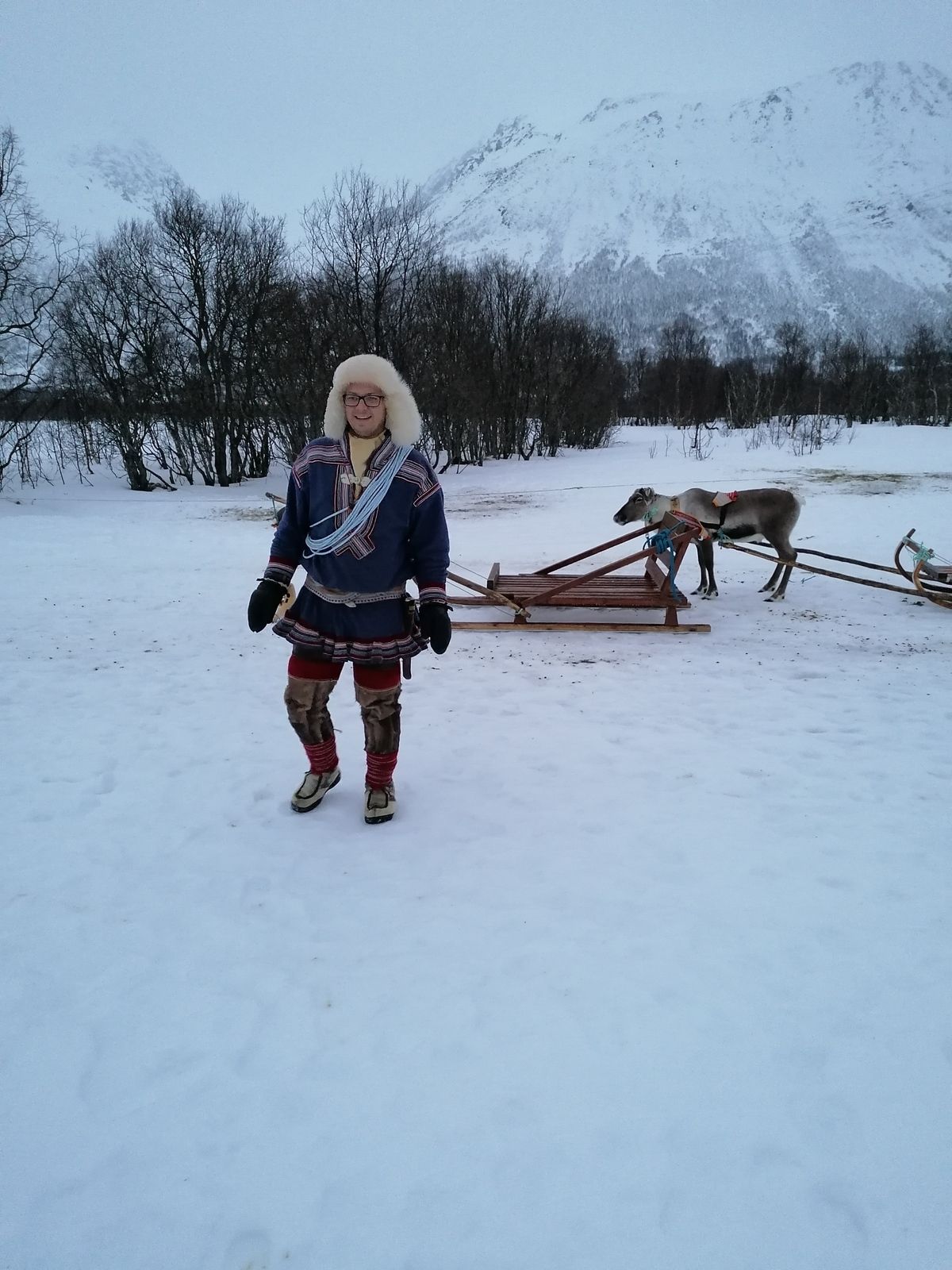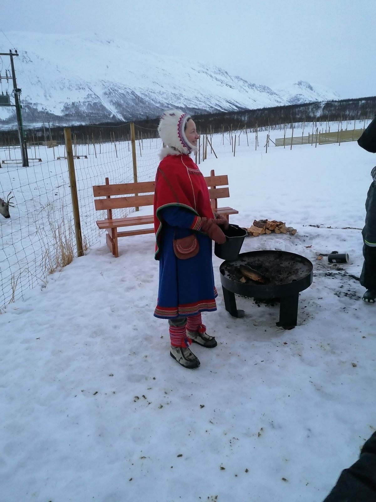 Im Anschluss gab es eine warme Mahlzeit. Eine gewöhnungsbedürftige Rentierfleischsuppe mit Brot, Butter und Heißgetränken. Diese wird im "Zelt aus Holz" zum Kaminfeuer herum eingenommen, sehr urig. Betrieben wird alles von einer Samenfamilie in Trachten.